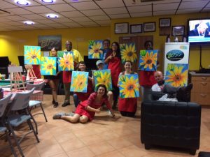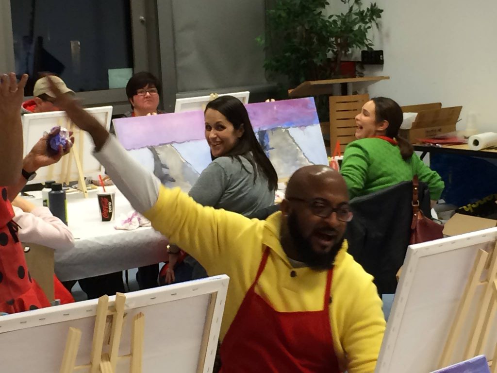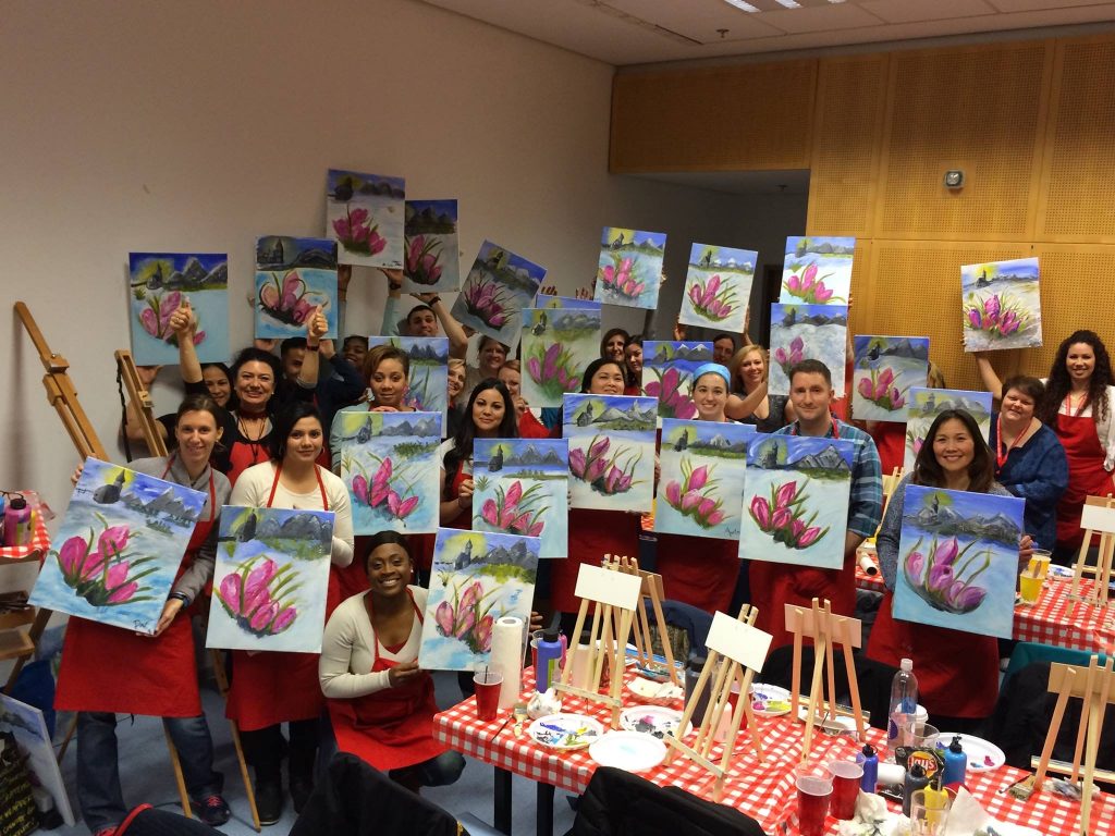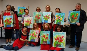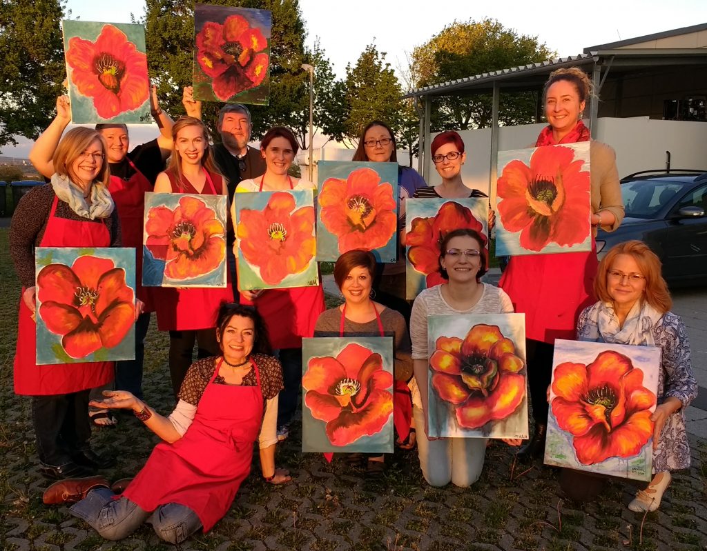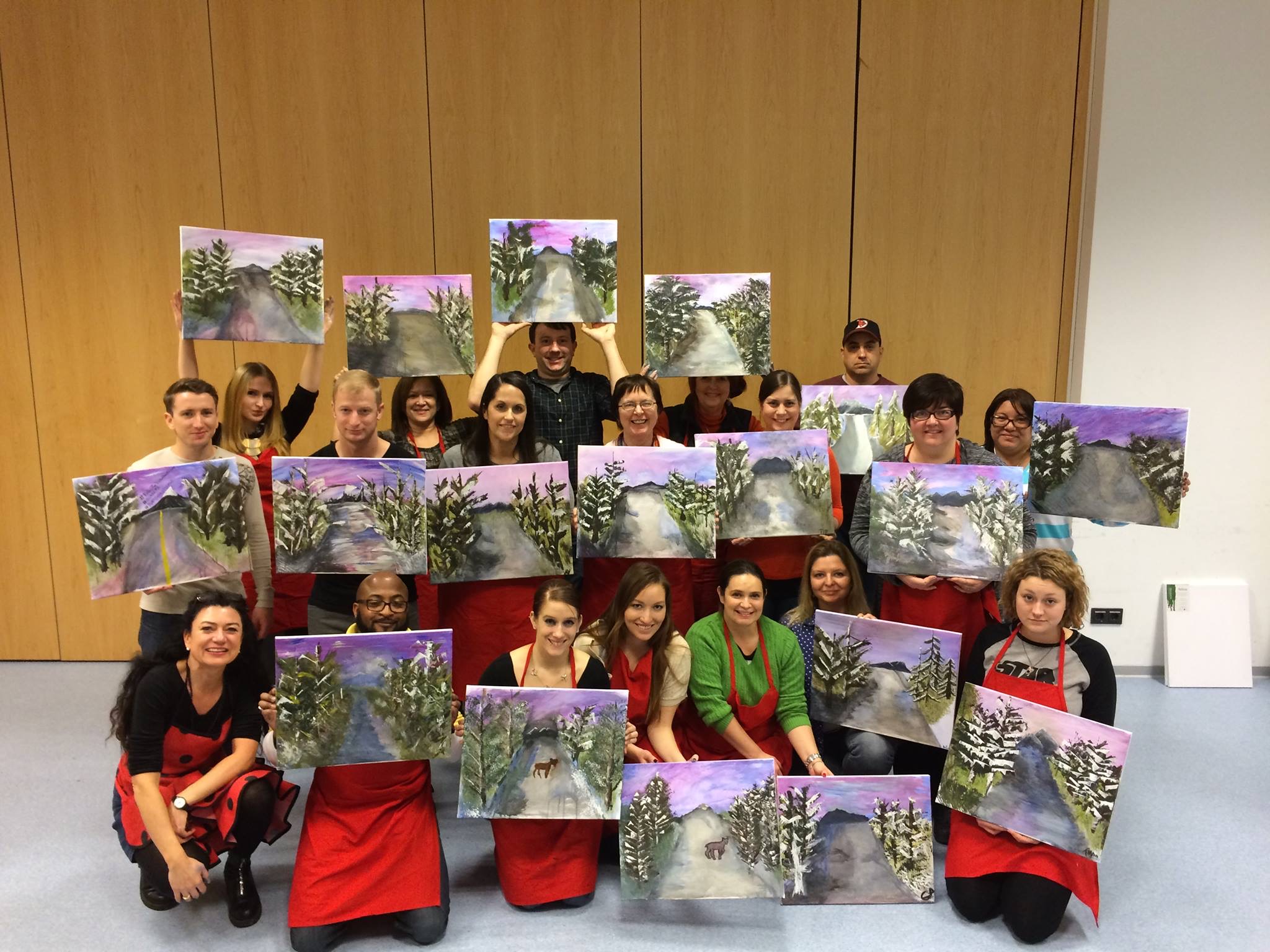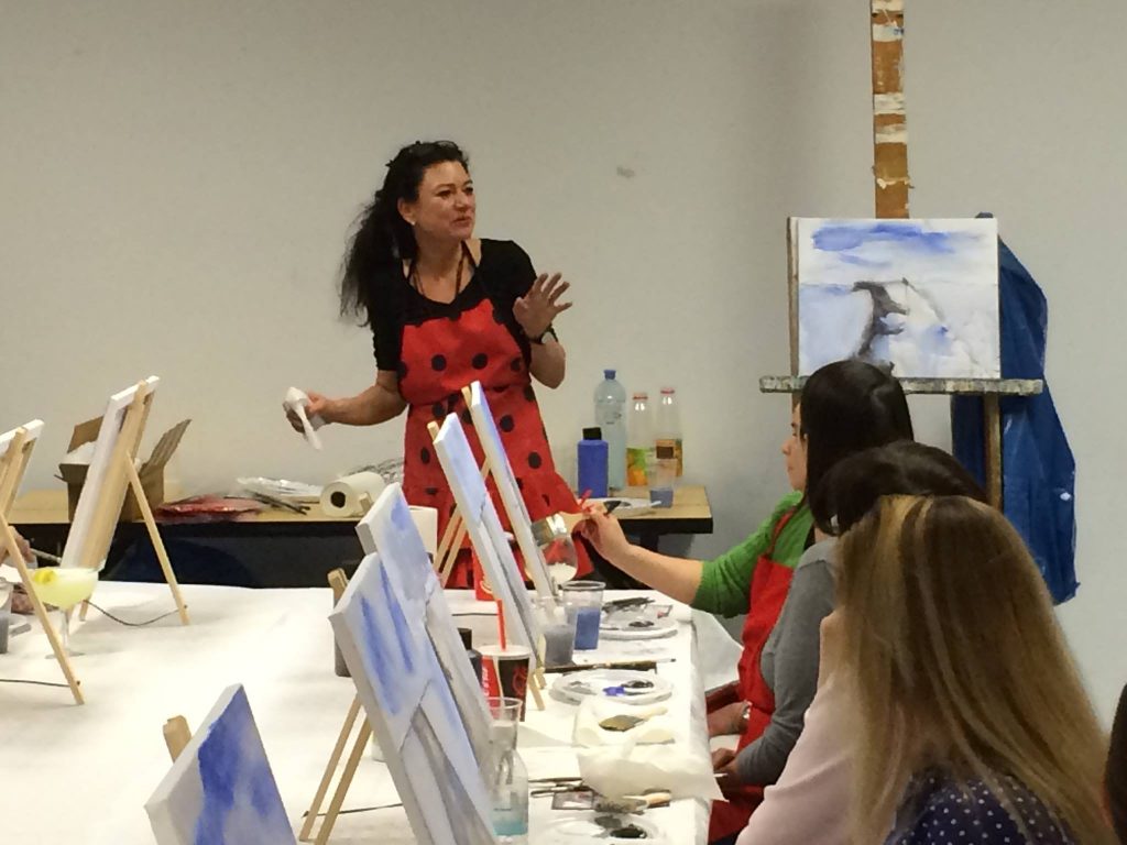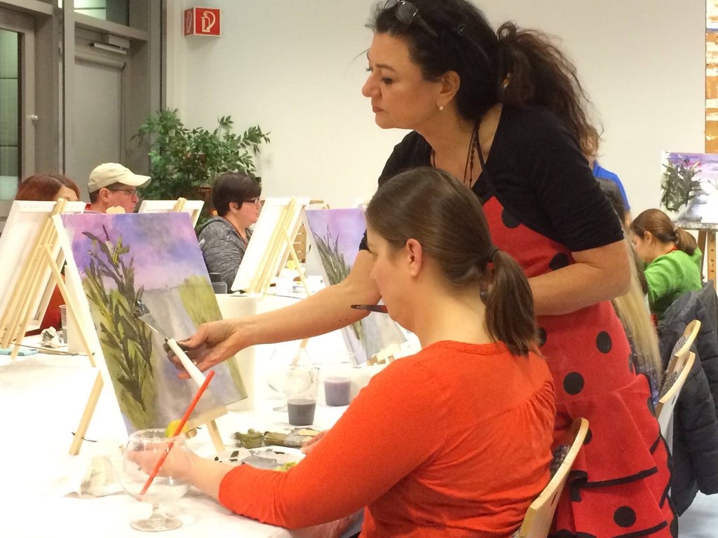 „Canvas & Corkscrews“ are classes for having fun together where no special art skills are required. Step-by-step, we are painting the same motive and then we take a group photo.